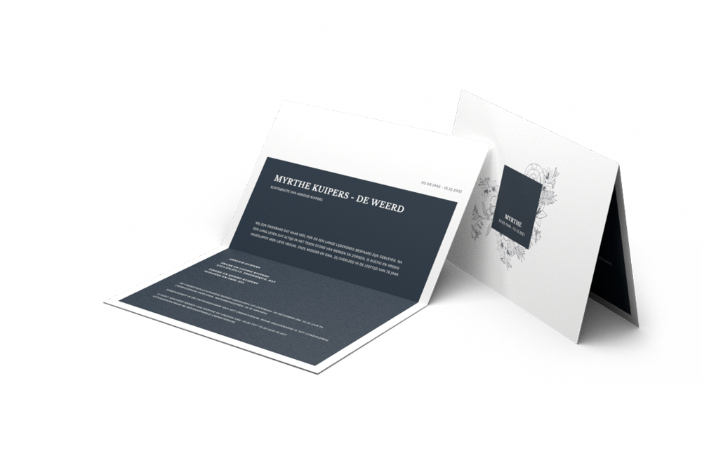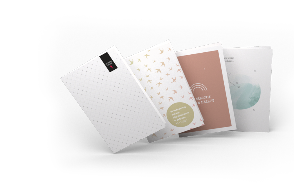 Kies je ontwerp, maak je eigen tekst en vraag je uitvaartverzorger alles te regelen. Eenvoudig, snel en altijd puur en persoonlijk.